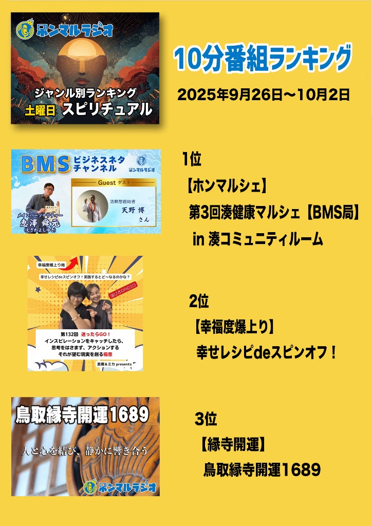 皆様、お陰様で ほんまるラジオ先日放送された、番組が スピリチュアル部門でランキング1位になりました。